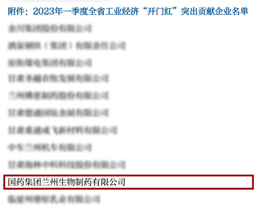 近日,经甘肃省政府研究,甘肃省工信厅决定对全省工业经济一季度“开门红”作出突出贡献的48户企业予以通报表扬。国药集团兰州生物制药有限公司荣获“2023年一季度甘肃省工业经济突出贡献企业”荣誉称号。
